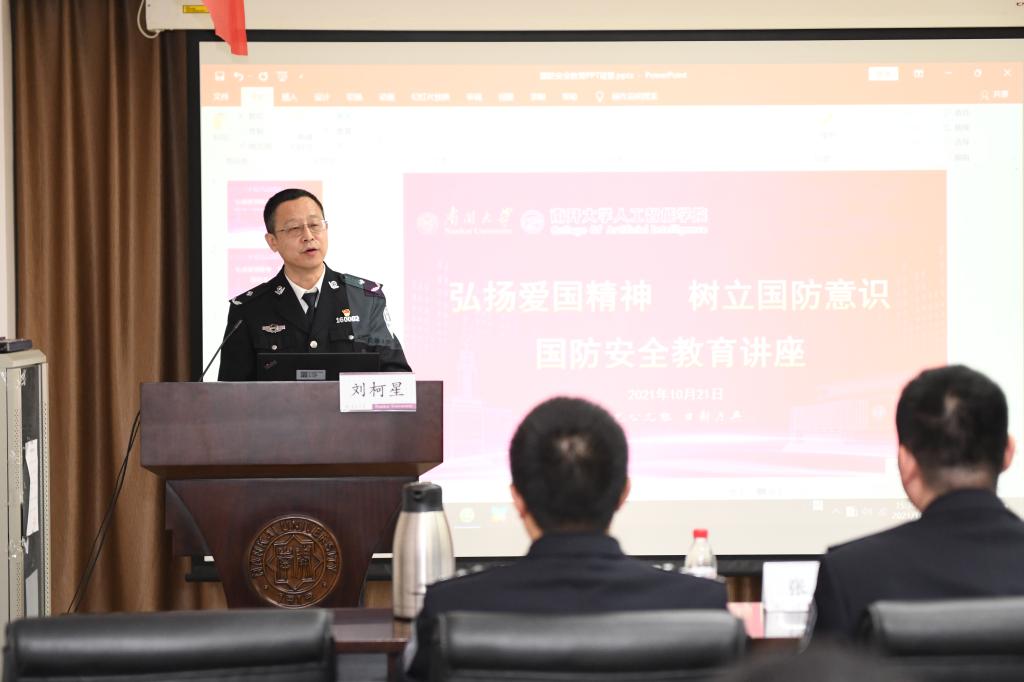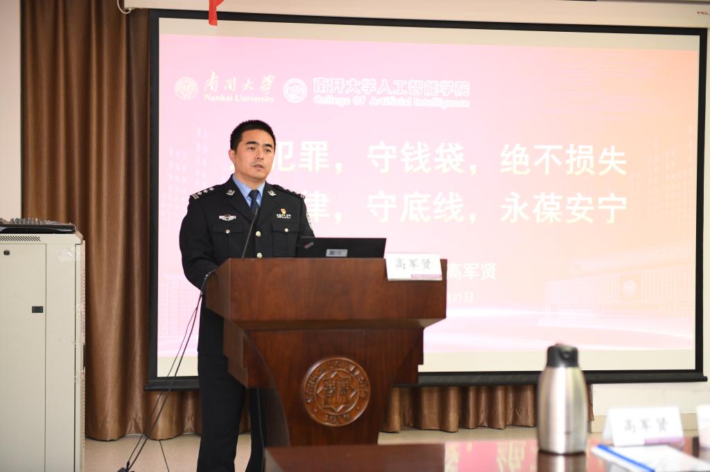 随后,为进一步做好此次共建活动,在学生中普及国防安全知识,提高学生的爱国意识,天津市公安局经侦总队为本科新生开展“国防安全教育”讲座。经侦总队一支队政委高军贤从自己的工作心得、预防电信诈骗犯罪方法、日常生活中可能接触到的经济犯罪等三个方面和大家进行了沟通交流,上了一堂精彩的思政课。