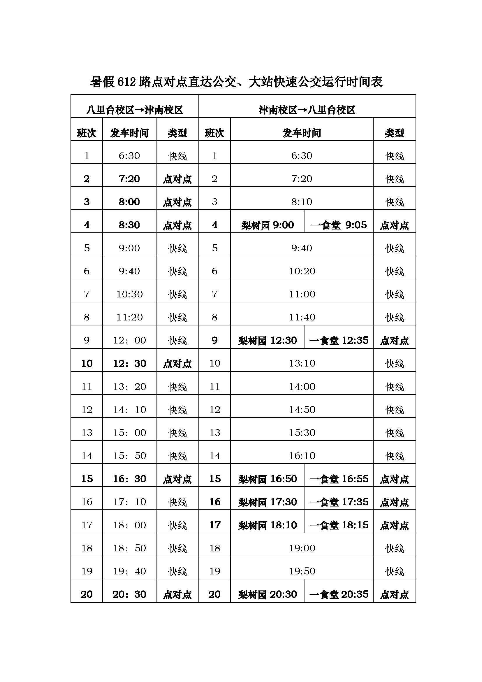 8月2日—9月10日(含周六、日及法定节假日)实行暑假运行方案。在612路点对点直达公交和大站快速公交运行间隙,根据实际需求安排普线公交。津南校区225路校园公交停运。9月11日612路点对点直达公交、大站快速公交、普线公交及225路校园公交恢复正常运行模式,其中9月15日、16日(周六、日)按工作日方案运行。