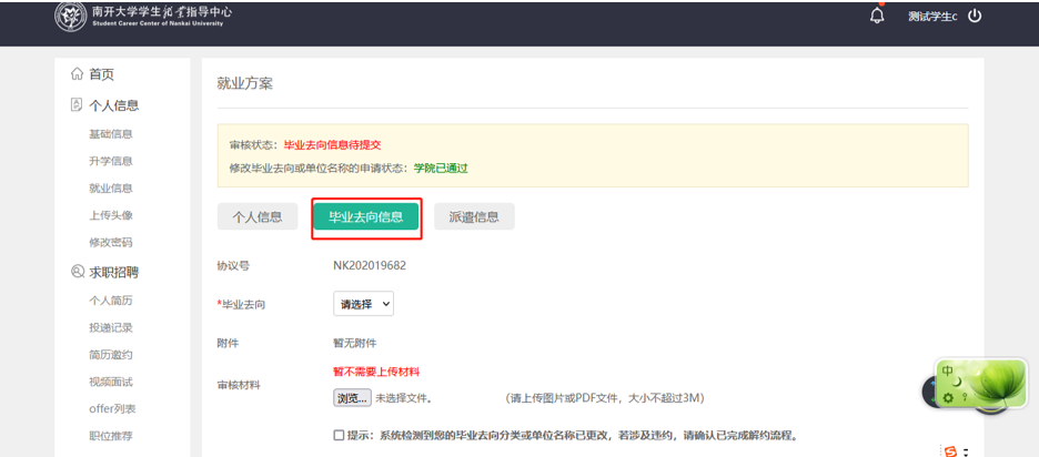 学生点击毕业去向信息对毕业去向信息进行编辑,并提供相应证明材料,如下图所示。提交后,联系学院辅导员、就业干部进行审核。(毕业去向信息学院审核通过后才可以录入派遣信息)