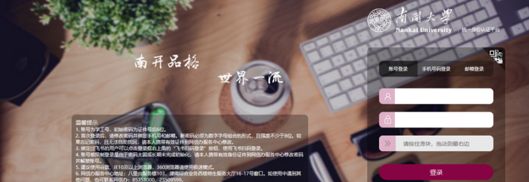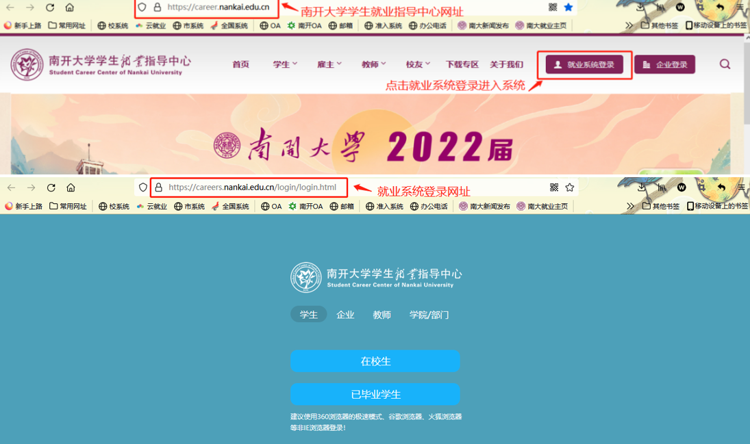 打开浏览器(为避免出现系统不兼容部分功能无法正常操作的情况,请使用360浏览器的极速模式、谷歌浏览器、火狐浏览器等非IE浏览器),输入Betway·必威(西汉姆联)学生就业指导中心网址:https://career.nankai.edu.cn/,点击就业系统登录或就业系统登录网址:https://careers.nankai.edu.cn/login/login.html进入登录界面。如下图所示:
