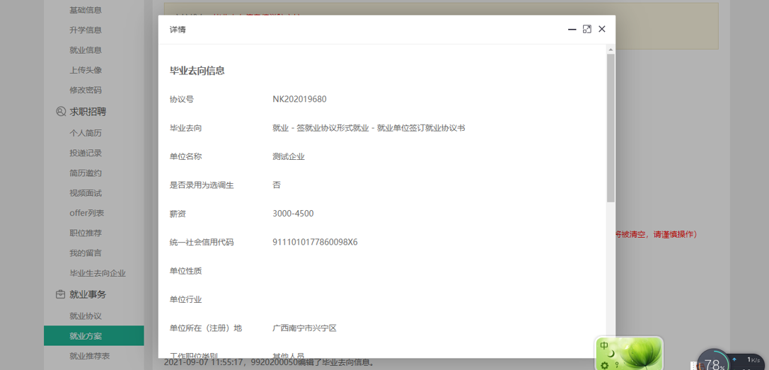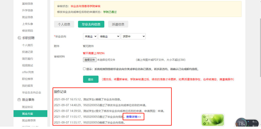 注:学生可从审核记录里查看填写的就业方案(毕业去向信息和派遣信息)历史信息,如下图所示:
