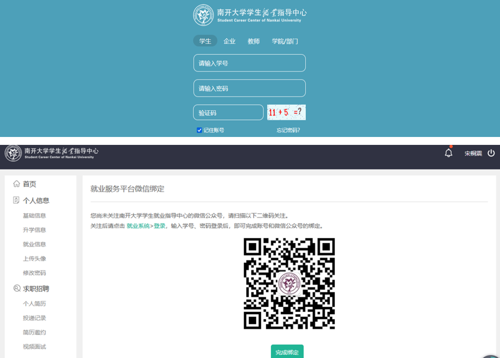 初次登录就业系统的学生请先关注Betway·必威(西汉姆联)学生就业指导中心的微信公众号后请点击“就业系统”—>“登录”,登录后即可完成账号和微信公众号的绑定。点击“完成绑定”进入系统操作界面。