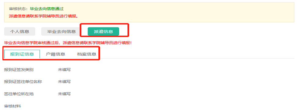 派遣信息由报到证信息、户籍信息和档案信息三部分构成,毕业去向信息学院审核通过,学生确认好派遣信息,并取得相应证明材料后,联系学院辅导员、就业干部,由学院在规定时间段内完成录入(具体时间等学院通知)。(录入的派遣信息学生可在派遣信息界面进行查看)