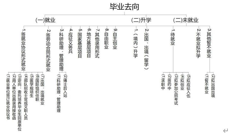毕业去向分为就业、升学、未就业三大类,具体去向分类见下图: