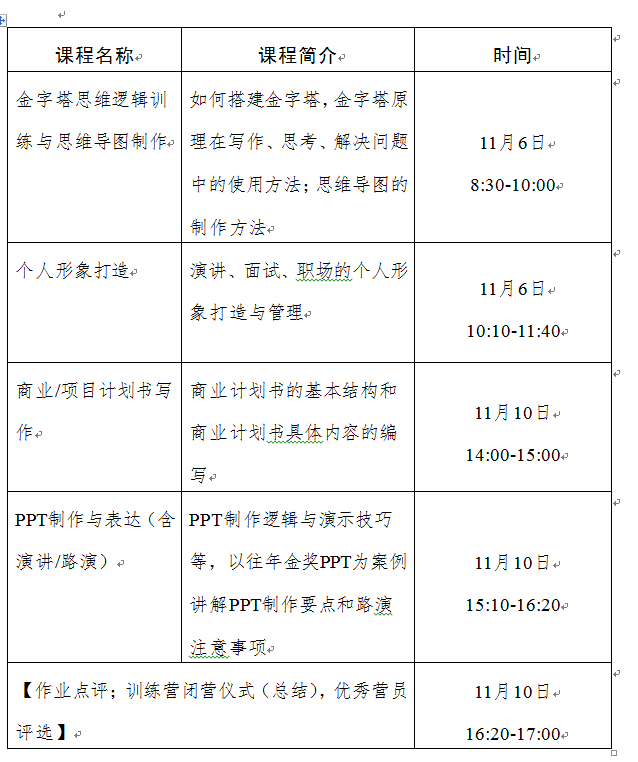 邀请校内外青年创客、投资人等,从基础逻辑思维训练,到PPT、商业计划书等制作方法,再到个人形象打造与演讲表达实战,帮助学生掌握应对大赛、路演、面试等各类场景需求的方法。