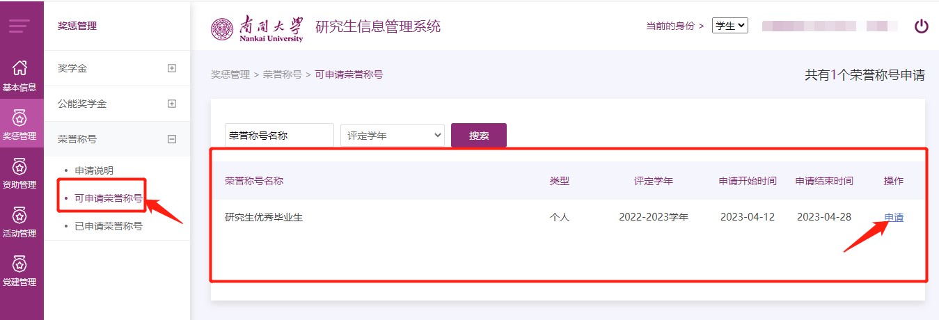 学生可在研究生信息管理系统奖惩管理模块下的荣誉称号菜单点击选择研究生优秀毕业生进行申请,填写信息并提交后可下载打印个人申请表用于后续考评环节。
