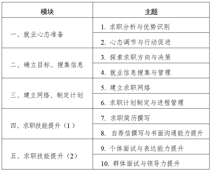 培训包含5个模块、10个主题,每个主题4课时(半天)。培训总时长为5天40课时。每个模块均包含基础知识、能力训练和态度改变三个部分,其中理论讲授和能力训练部分各占50%,注重引导学生在互动中探索职业方向、提升就业能力。