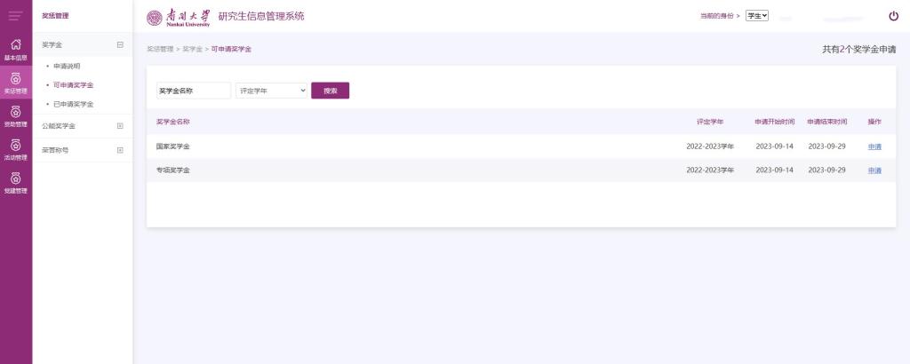 在奖学金模块中可以查看申请说明和当前可申请奖学金,本模块包含可申请有国家奖学金、周恩来奖学金、公能奖学金、专项奖学金。