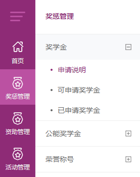 申请人登录系统后,鼠标滑动到左侧“奖惩管理”栏目,显示“奖学金”、“公能奖学金”、“荣誉称号”。如下图: