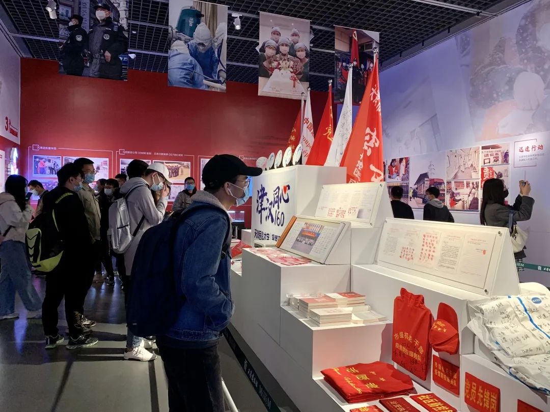 伴随着天津博物馆大门的缓缓打开,同学们首先参观的是“人民至上——天津市抗击新冠肺炎疫情纪实展”宏伟展厅。纪实展主要由六大部分构成: