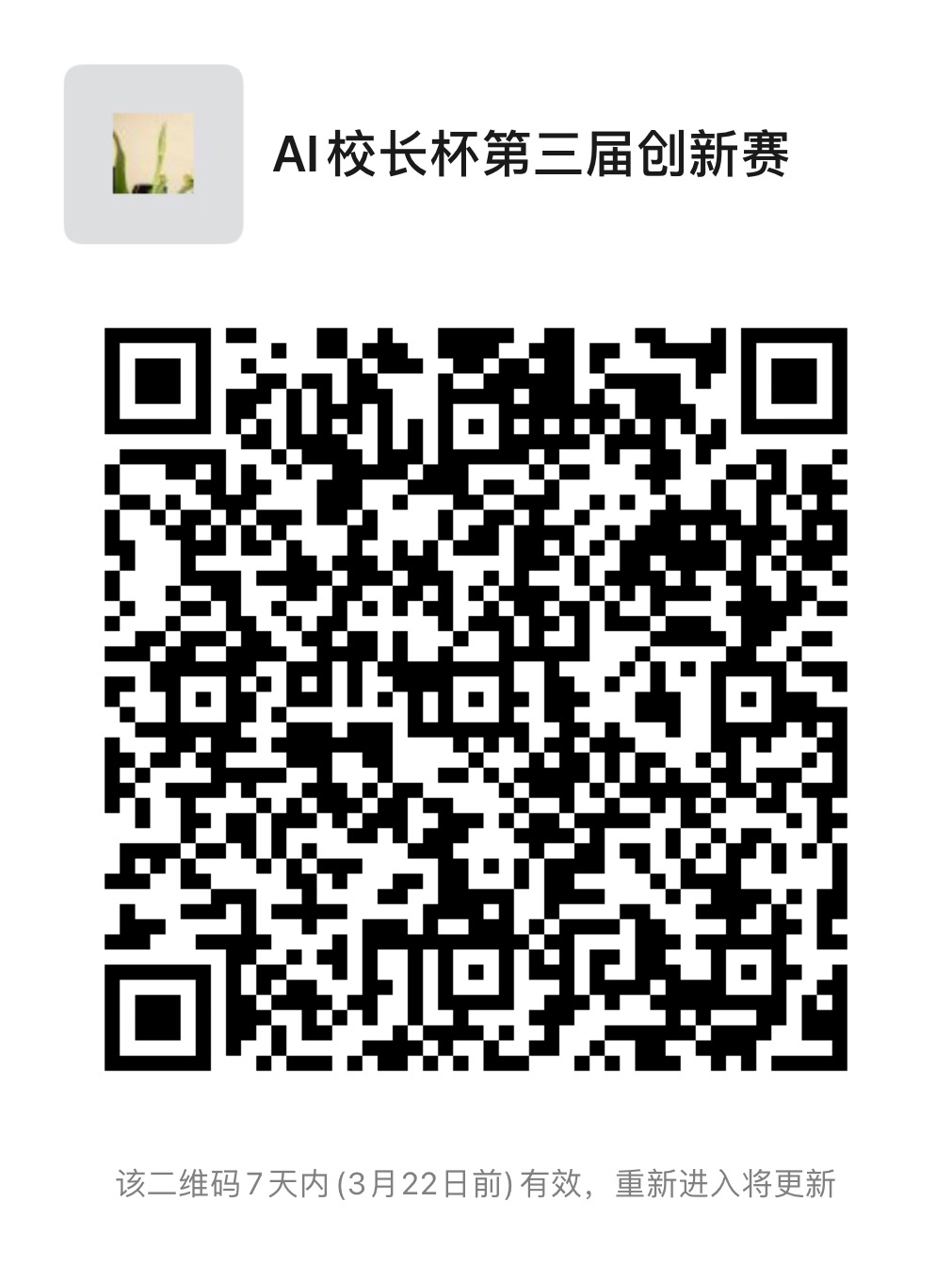 2.请已提交报名材料及拟报名参加本届“校长杯”创新赛的同学扫描下方二维码,加入“AI校长杯第三届创新赛”微信群,后续学院相关通知将在群内发布。