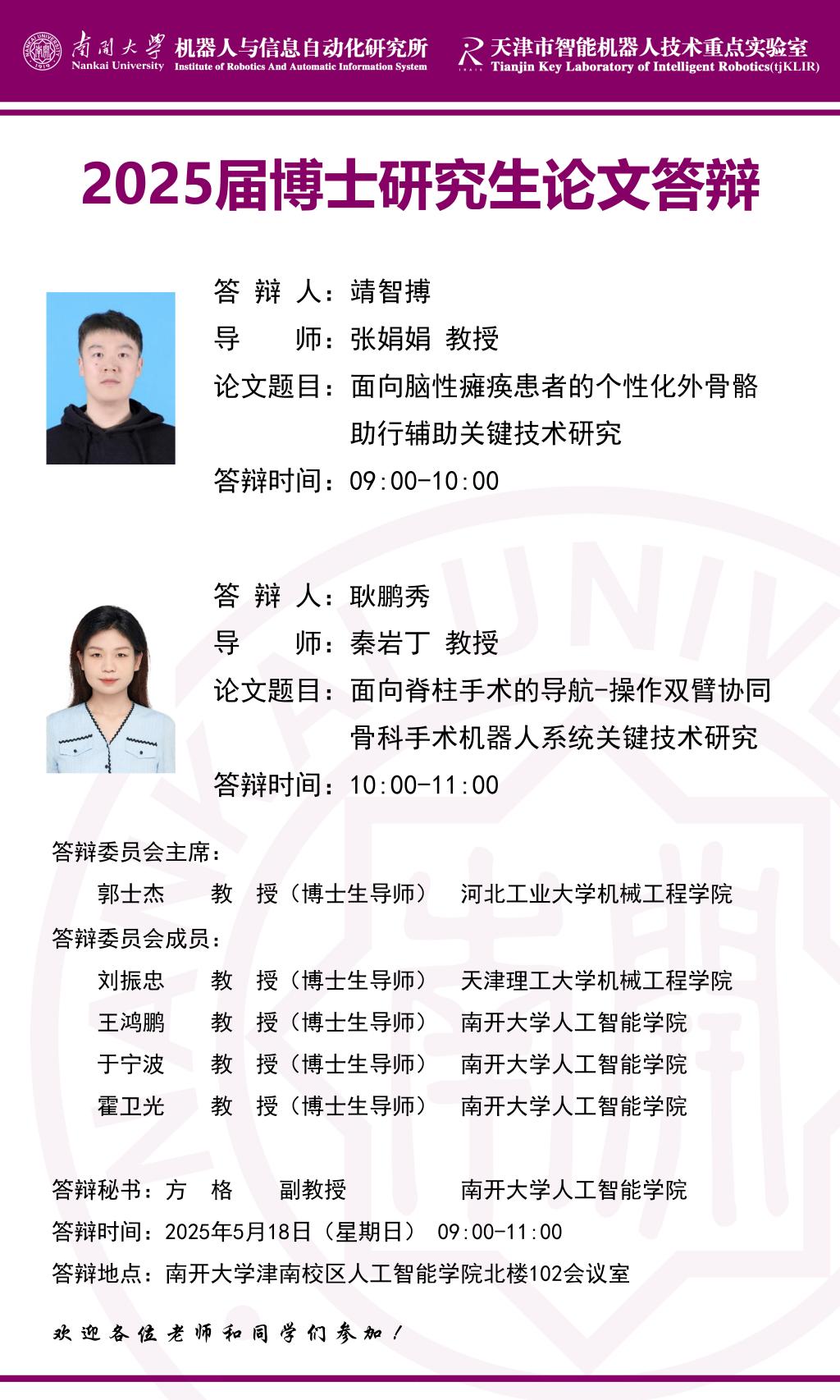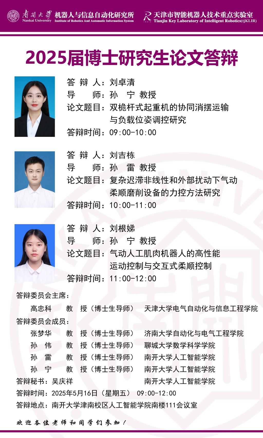 【答辩】必威betway西汉姆联2025届夏季毕业答辩公告----机器人与信息自动化研究所(博士)