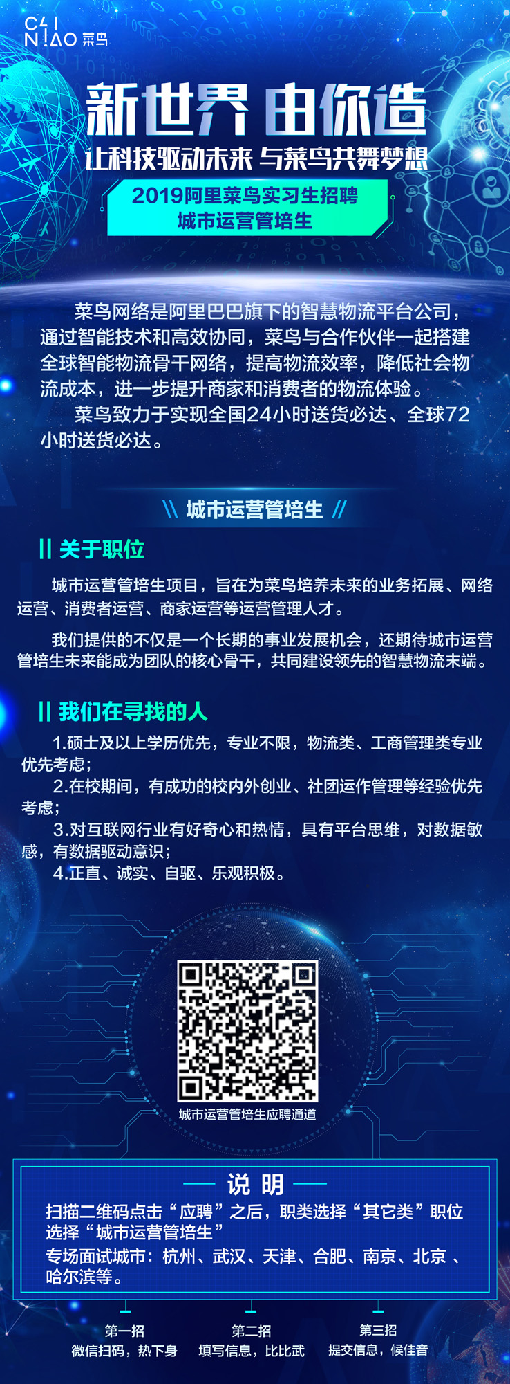 城市运营管培生项目,旨在为菜鸟培养未来的业务拓展、网络运营管理、消费者运营管理、商家运营管理等运营管理人才。我们提供的是一个长期的事业发展机会,期望城市运营管培生未来能成为团队的核心骨干。